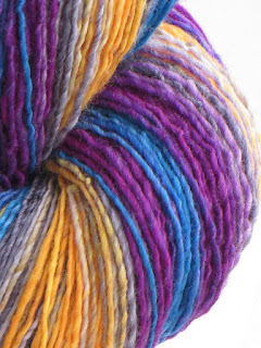 Es waren ziemlich zerrupfte Endstücke eines Kammzugs und diese sahen nach der Färbung natürlich nicht besser aus. Dem Garn sieht man die Fledderei nun nicht mehr an. Das Knäulchen konnte ich mit einer Lauflänge von 246 m und 83 g schon auswerten. Wären es 100 g, hätte es eine Lauflänge von 296 m.  O..O  ("Ich dachte, da wär mehr drin...") Ganz ehrlich, es hat die gleiche Stärke wie gekauftes Singlegarn von 400 m Länge.